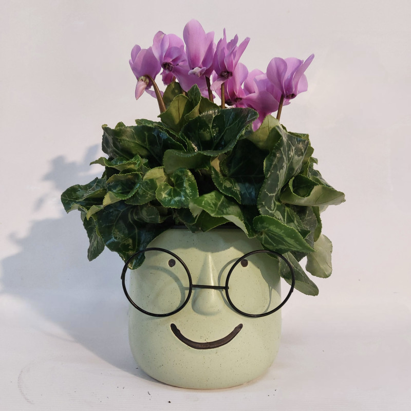 ציקלמן ורוד בעציץ ראש משעשע עם משקפיים. מתנה מקורית ומלאת אופי, שמתאימה לבית, למשרד ולכל אירוע.